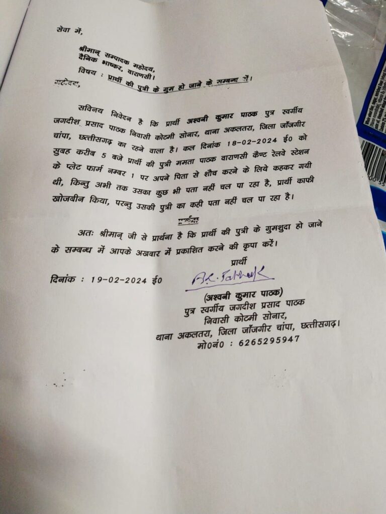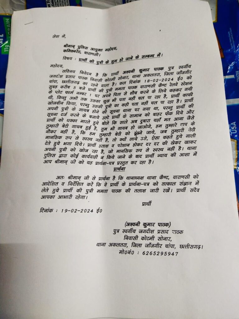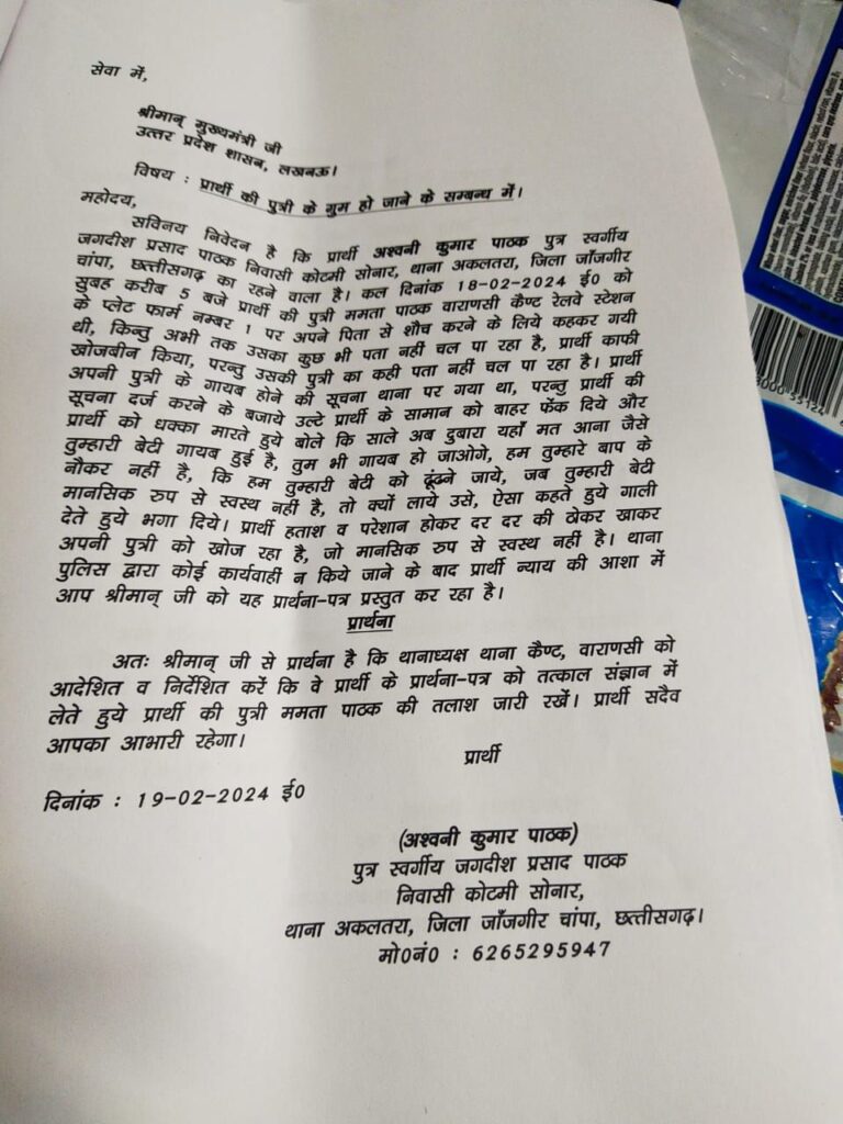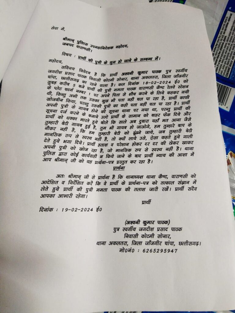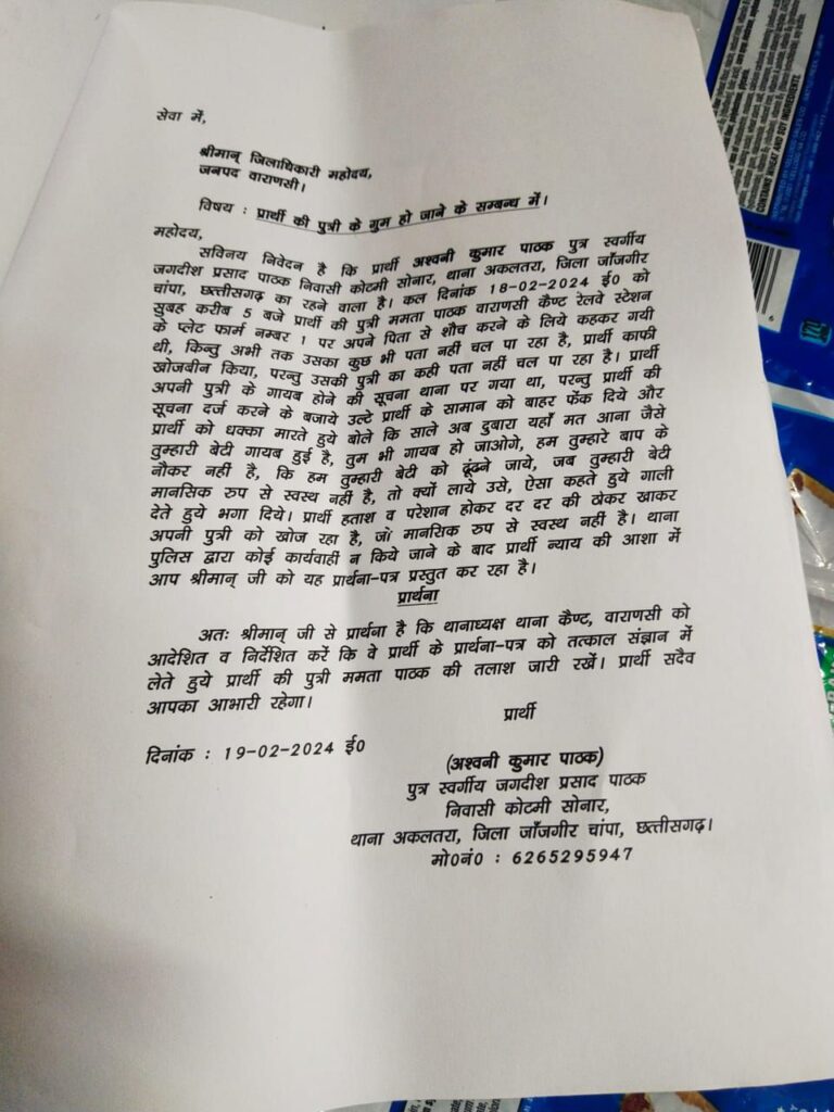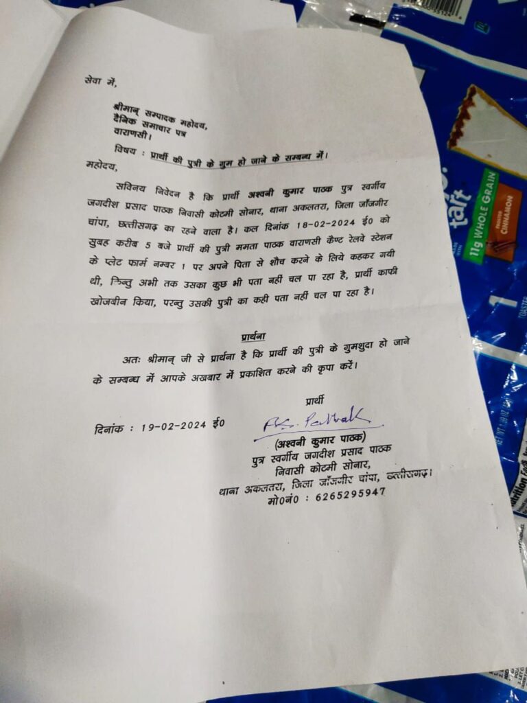 एक बेबस पिता काशी में खोज रहा है अपनी बेटी को, जो रात में किसी समय बाथरूम जाने की कहकर,पिता के पास से उठी थी,कुछ ही देर के लिए हुई थी नजरो से ओझल और गुम हो गई ! जानकारी अनुसार अश्विनी पाठक बिलासपुर छत्तीसगढ़ से काशी तीर्थ यात्रा हेतु गए थे कि काशी स्टेशन पर उनके साथ यह घटना घट गई ?