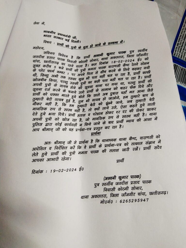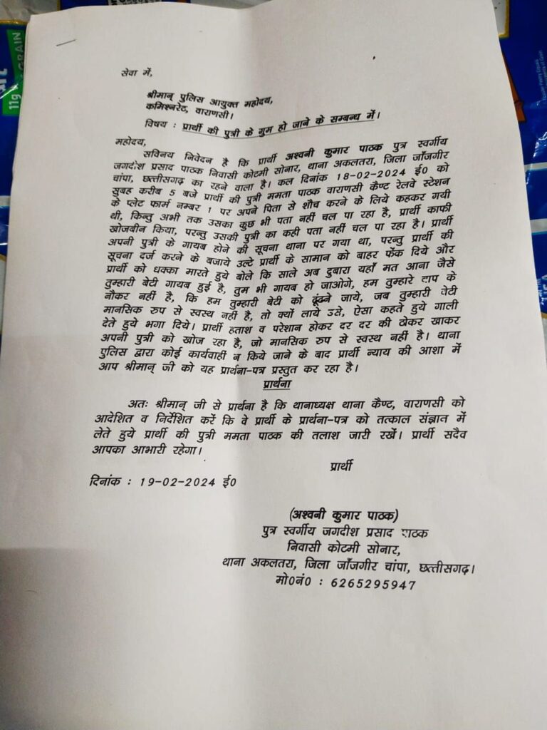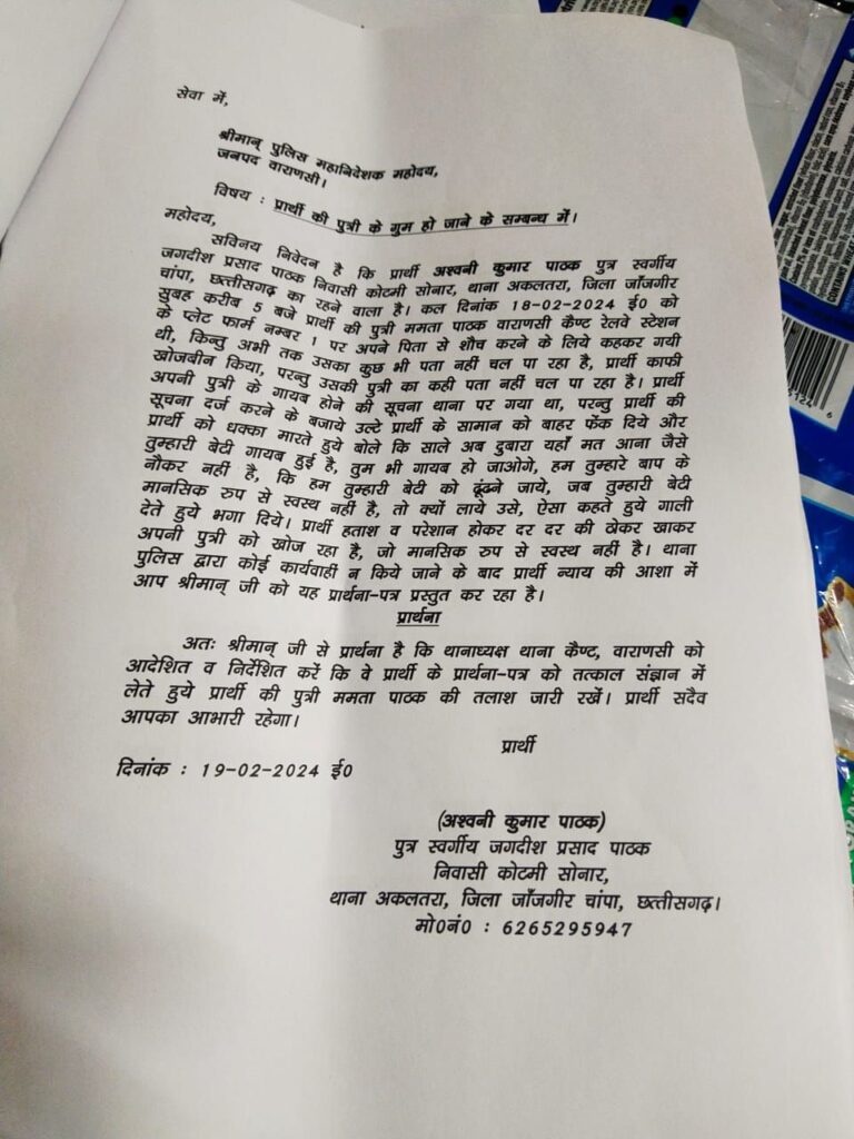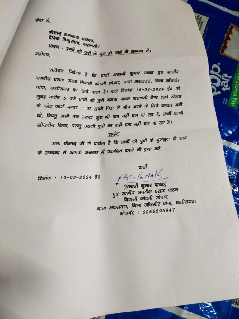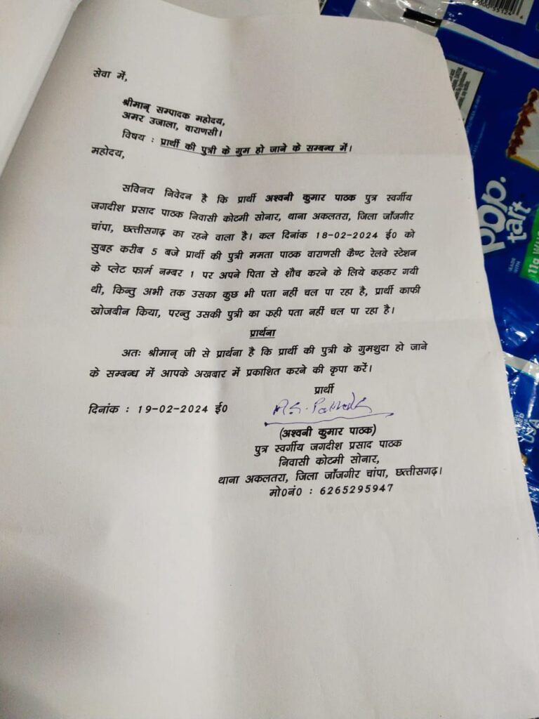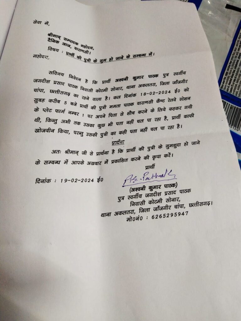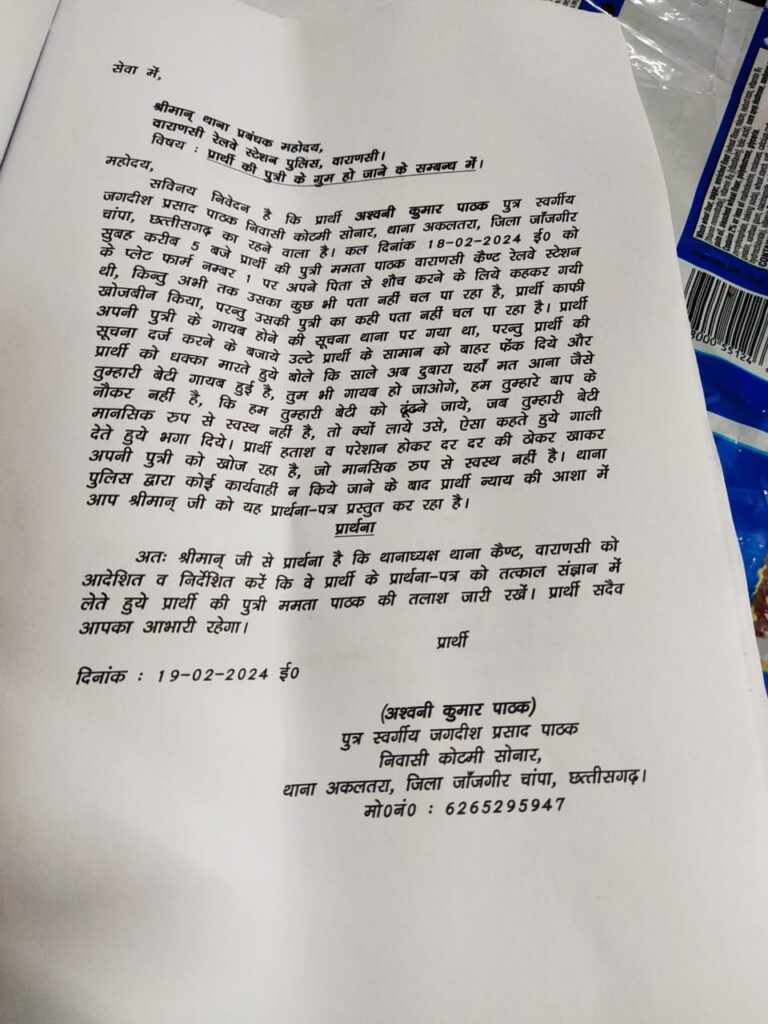 एक बेबस पिता काशी में खोज रहा है अपनी बेटी को, जो रात में किसी समय बाथरूम जाने की कहकर,पिता के पास से उठी थी,कुछ ही देर के लिए हुई थी नजरो से ओझल और गुम हो गई ! जानकारी अनुसार अश्विनी पाठक बिलासपुर छत्तीसगढ़ से काशी तीर्थ यात्रा हेतु गए थे कि काशी स्टेशन पर उनके साथ यह घटना घट गई ?