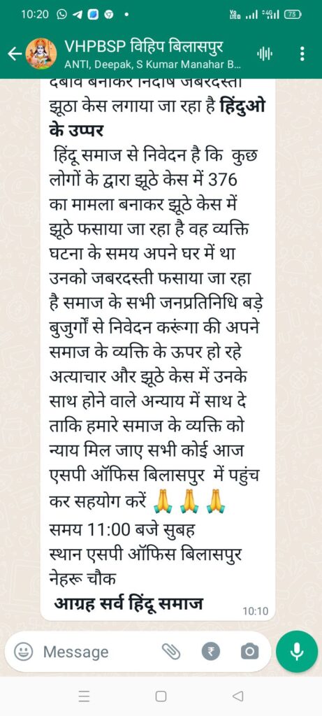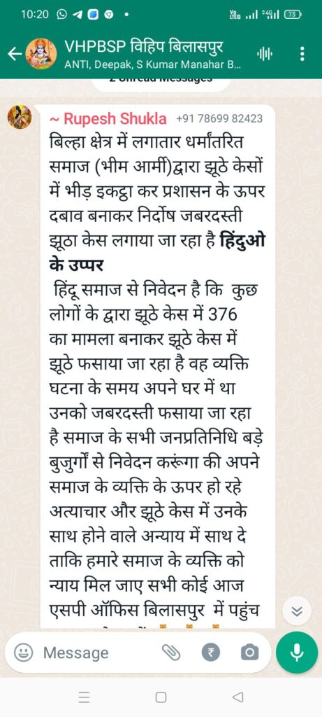 बिल्हा क्षेत्र में लगातार धर्मांतरित समाज (भीम आर्मी)द्वारा झूठे केसों में भीड़ इकट्ठा कर प्रशासन के ऊपर दबाव बनाकर निर्दोष जबरदस्ती झूठा केस लगाया जा रहा है यादव, कुर्मी, साहू, निर्मल समाज के प्रमुख जनों से निवेदन है कि को (सतनामी समाज) के कुछ लोगों के द्वारा झूठे केस में 376 का मामला बनाकर झूठे केस में झूठे फसाया जा रहा है वह व्यक्ति घटना के समय अपने घर में था उनको जबरदस्ती फसाया जा रहा है समाज के सभी जनप्रतिनिधि बड़े बुजुर्गों से निवेदन करूंगा की अपने समाज के व्यक्ति के ऊपर हो रहे अत्याचार और झूठे केस में उनके साथ होने वाले अन्याय में साथ दे ताकि हमारे समाज के व्यक्ति को न्याय मिल जाए सभी कोई आज एसपी ऑफिस बिलासपुर में पहुंच कर सहयोग करें 🙏🙏🙏