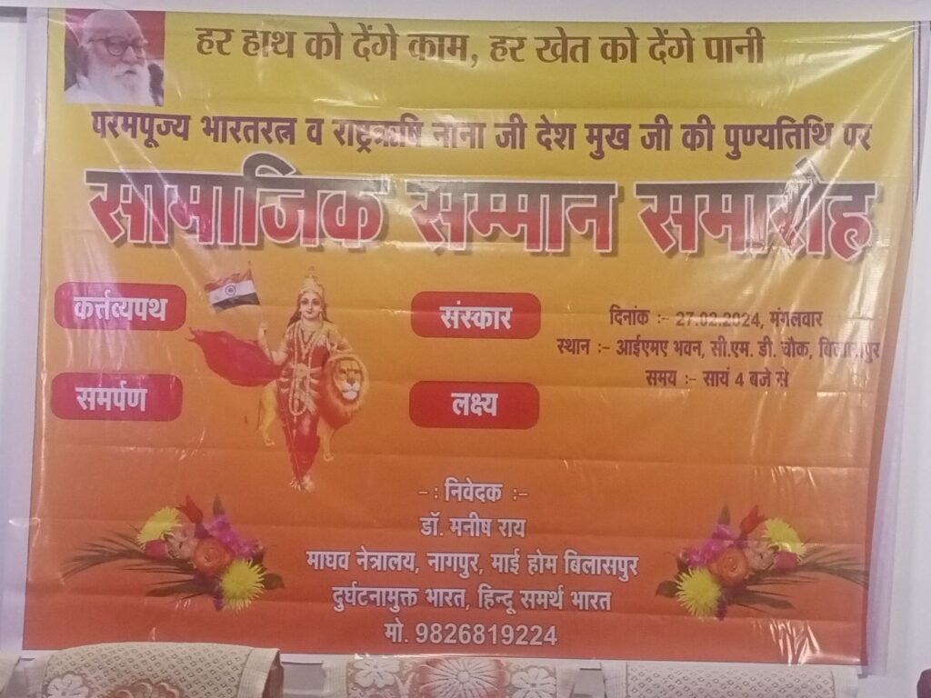 27 फरवरी को भारत रत्न और राष्ट्रऋषि नानाजी देशमुख की पुण्यतिथि पर सामाजिक सम्मान समारोह आयोजित किया गया। इस कार्यक्रम के मुख्य अतिथि जिला संघ चालक श्री रामधन रजक , आरएसएस, अध्यक्षता श्रीमती अर्चना झा, अति. पुलिस अधीक्षक , विशिष्ट अतिथि श्री प्रदीप शर्मा, नगरसंघचालक, श्री प्रदीप देशपांडे, सेवा भारती प्रमुख, श्री महावीर सिंह, प्रांत अभिलेखागार प्रमुख, डॉ. विनोद तिवारी, टोली प्रमुख, श्री विश्वास जलतारे, प्रांत शारीरिक शिक्षण प्रमुख और कार्यक्रम का संचालन डॉ. मनीष राय, निदेशक माधव नेत्रालय नागपुर सक्षम, माई होम बिलासपुर एवं दुर्घटनामुक्त भारत के राष्ट्रीय संगठन मंत्री ने किया ।
