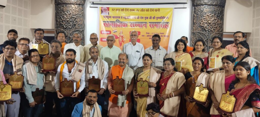 सम्मानित लोगो में दुजराम, एवम भारत भूषण को बिना किसी सरकारी सहायता के जगह जगह वृक्षारोपण करने हेतु दिव्यांग हरिहर सिंह राजपूत को पैराओल्मपिक में राष्ट्रीय खिलाड़ी हेतु , डी विनीता राव को भोजन सेवा के क्षेत्र में,डी निहारिका राव को गौ सेवा के क्षेत्र में, गोपाल कश्यप को रक्त दान, गौ सेवा,हेतु, रूपेश शुक्ला को रक्त दान हेतु, स्वाति गुप्ता, को झुग्गी झोपड़ी में बच्चो को निशुल्क शिक्षा गुड touch bad touch का प्रशिक्षण देने में, शैलेंद्र पाठक एवम गौतम बोंद्रे को पत्रकारिता के क्षेत्र में, पवन रज्जक को सामाजिक सामूहिक विवाह आयोजन में, महेंद्र जैन को वन्दे मातरम् मित्र मंडल संयोजक के रूप में हिंदुओ को संगठित करने के अभियान हेतु, अंजली चावड़ा को डायनस इन ड्रोम एवम ओटी क्जाम में बच्चो को शिक्षित करके हेतु, अंजना वर्मा को राज्य स्तरीय फुटबॉल नेशनल क्रिकेट प्लेयर के क्षेत्र में,राम सिंह ठाकुर, को गौ रक्षक हेतु उल्लेखनीय कार्य हेतु श्याम मोहन डूबे को आखा अर्पण समिति वृक्षा रोपण हेतु, डॉ. नीरज शेंडे प्रोफेसर सर्जरी के महत्वपूर्ण योगदान हेतु, डॉ. आर. के. दास प्रोफेसर आर्थो पेडिक क्षेत्र में सेवा हेतु, डॉक्टर पंकज टेंबूनिकर को मेडिसन के क्षेत्र में, डॉ अमित ठाकुर प्रोफेसर मेडिसन, डॉ. दीपिका सिंह गायक्लोनिष्ट के क्षेत्र में, चुन्नी मौर्य को समाज सेवा हेतु एवम सत्ता से सवाल संचालक पवन गोयल को निडरता के साथ, निष्पक्षता के साथ हिंदूवादी पत्रकारिता में विशेष योगदान के लिए सम्मानित किया गया । सभी को पुरुस्कार के रूप में प्रतीक चिन्ह सहित शाल ओढ़ाकर सम्मानित किया गया! श्री प्रदीप देशपांडे ने नानाजी के कार्य और विचार पर प्रकाश डाला और उनके आदर्शो पर चलने की आवाहन किया । अर्चना झा ने महिला सशक्तिकरण और ग्रामोदय पर नानाजी देशमुख के जीवन पर बोलते हुए राष्ट्र को समर्पित होने की बात कही । महावीर सिंह ने कहा कि ग्राम और स्वास्थ्य को जानना हो तो नानाजी देशमुख के जीवन और कार्यों को जानो और समाज को देना सीखो । अपने प्रस्तावना में डॉ. मनीष राय ने नानाजी देशमुख की स्मृति में हर वर्ष 5 लोगो को सम्मानित कर आर्थिक सहयोग देने की घोषणा की । यह सम्मान पद्विभूषण जैसा सम्मानित होगा और आर्थिक रूप से भी पुरस्कृत किया जाएगा । जिसका चयन समिति द्वारा किया जायेगा । इस कार्यक्रम को सफल बनाने में प्रभात राय, संदीप गोरे, आदित्य दास ने मिलकर कार्यक्रम को सफल बनाया । इस कार्यक्रम में शहर के सभी गणमान्य जन उपस्थित रहे और सभी ने इस भव्य एवम विशाल सामाजिक सम्मान समारोह की मुक्त कंठ से भूरी भूरी प्रशंसा व्यक्त की तथा आयोजक डॉक्टर मनीष राय को साधुवाद की संज्ञा दी है !