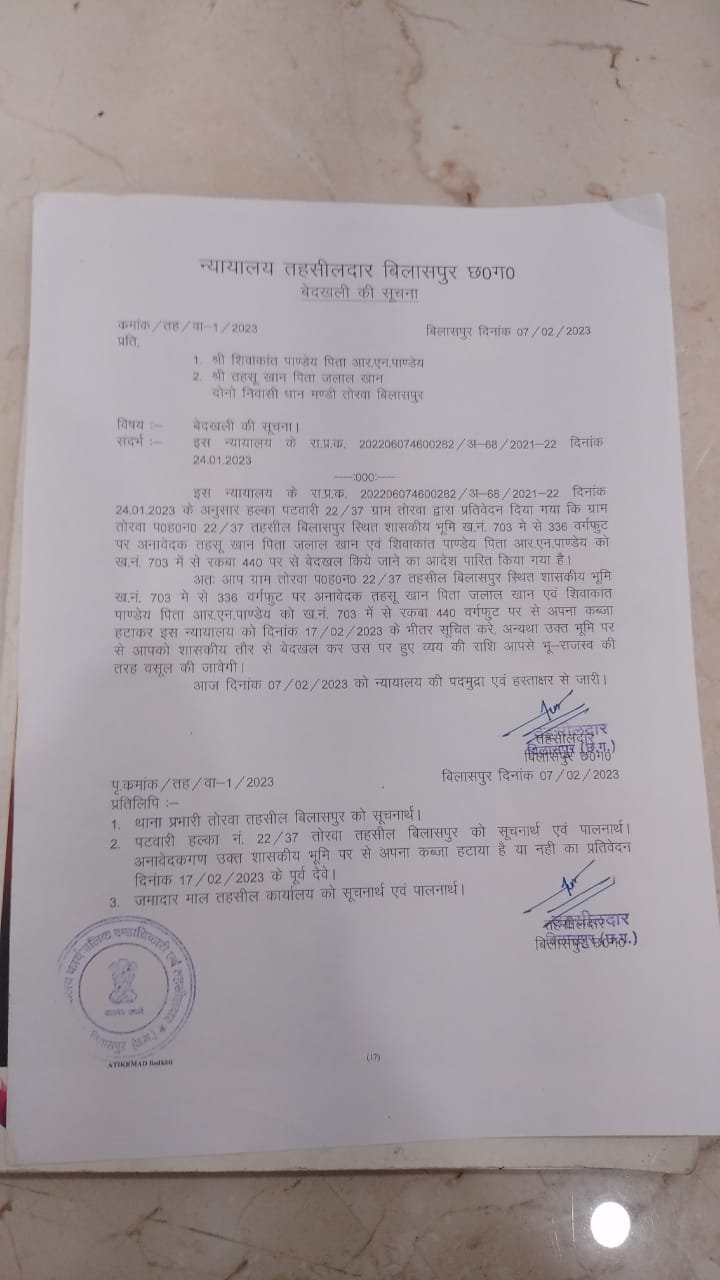 बिलासपुर तहसील के अंतर्गत मौजा तोरवा के अंतर्गत खसरा नंबर 703 की शासकीय भूमि पर पूर्व में दिनांक 23/10/2017 को हटाया गया था, लेकिन, दबंग भूमाफियाओ द्वारा पुन: उक्त बेशकीमती शासकीय भूमि पर अवैध कब्जा कर लिया गया है,