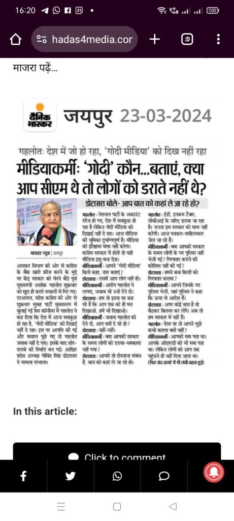 हुआ यू कि, जयपुर में अशोक गहलोत पीसी कर रहे थे तो आयकर विभाग द्वारा कांग्रेस के बैंक खाते फ्रिज किए जाने के बारे में बताते हुए कहने लगे कि गोदी मिडिया ये खबर नही दिखाएंगे ? हमारे जैसे किसी सनकी पत्रकार ने गहलोत से आखिरकार पूछ ही डाला कि, गोदी मिडिया है कौन?नाम बताओ ! तो गहलोत की बोलती हुई बंद ? जवाब देते नही बना !, कांग्रेस सत्ता में रहे या न रहे ?कांग्रेस की अपनी क्या राजनीतिक समस्या है कांग्रेस जाने ! लेकिन, जिसको, जब मन में आए ? कांग्रेसियों का भक्ति चालीसा न लिखे तो “गोदी मिडिया” के विशेषण से संबोधित कर किसी भी मिडिया को अपमानित कर जाए अब यह बिलकुल नही चलेगा ! हमारी यह आवाज सभी मिडिया तक पहुंचेगी इस आशय से लिख रहे है कि मिडिया कोई भी हो ?अब गोदी मिडिया जैसे विशेषण से निजात पाने का समय आ गया है ! चवन्नी छाप कांग्रेसी भी किसी भी मिडिया को “गोदी मिडिया” बोलकर अपनी औकात बता कर चल देता है ?हमे तो आश्चर्य यह है कि अभी तक देश का मिडिया इस विशेषण को ढो क्यों रहा है ? जैसे पत्रकार ने गहलोत की बोलती बंद किया उसी प्रकार सभी पत्रकार अपनी गरिमा की रक्षा करे !
