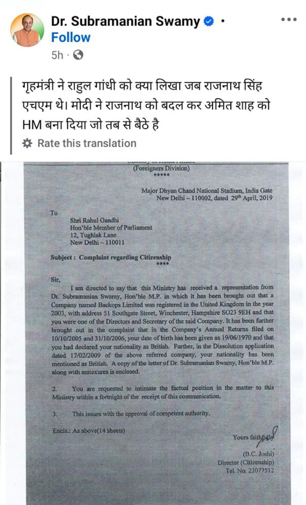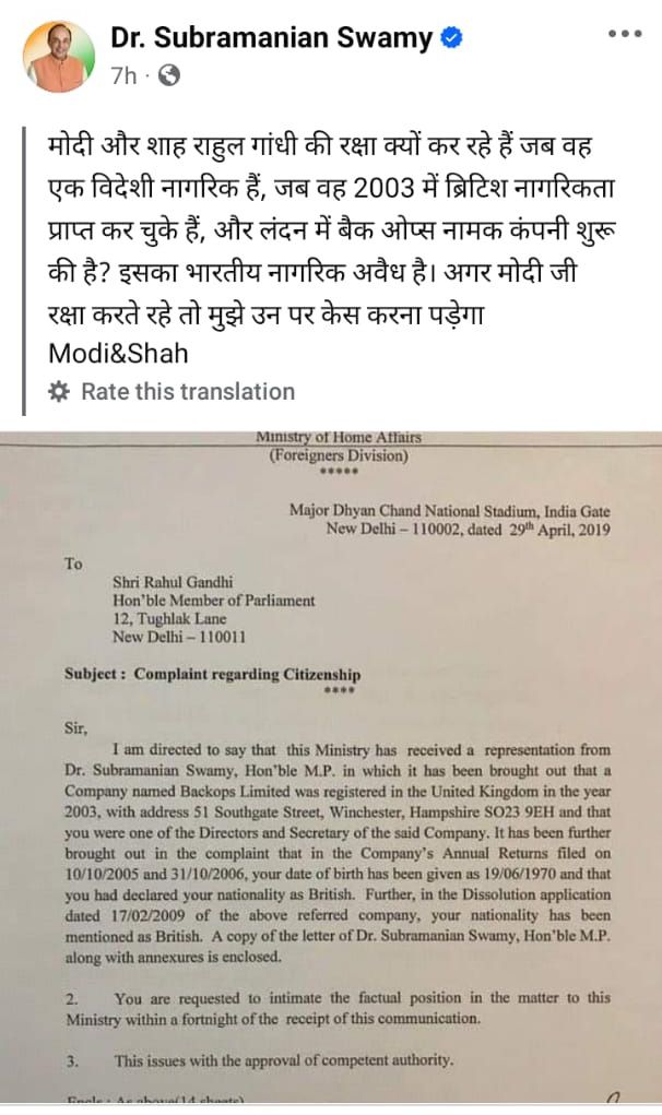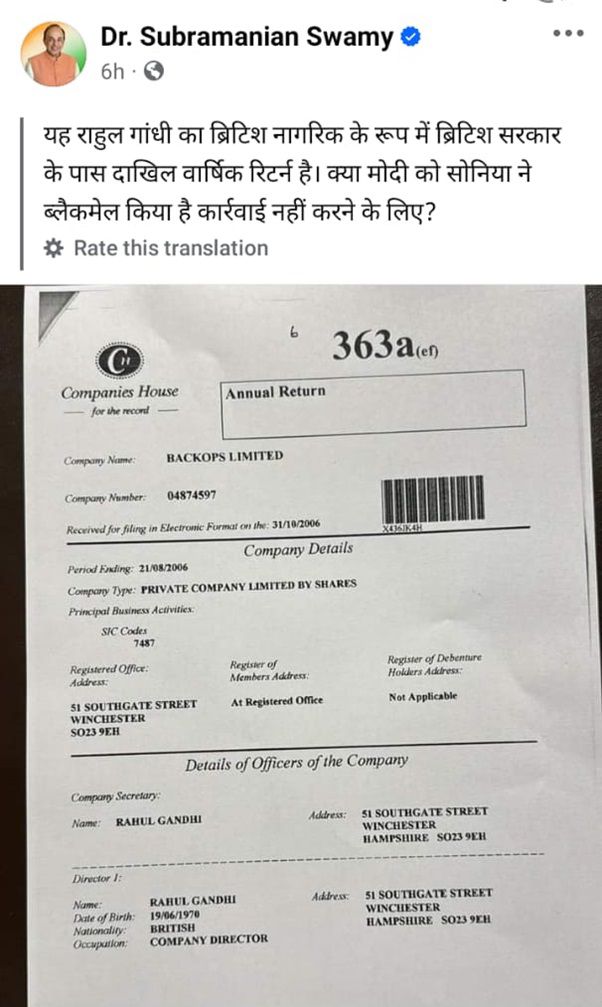 स्वामी ने अपनी पहली पोस्ट में लिखा है कि, “यह राहुल गांधी का ब्रिटिश नागरिक के रूप में ब्रिटिश सरकार के पास दाखिल वार्षिक रिटर्न है. क्या मोदी को सोनिया ने ब्लैकमेल किया है, कार्रवाई नहीं करने के लिए.”?