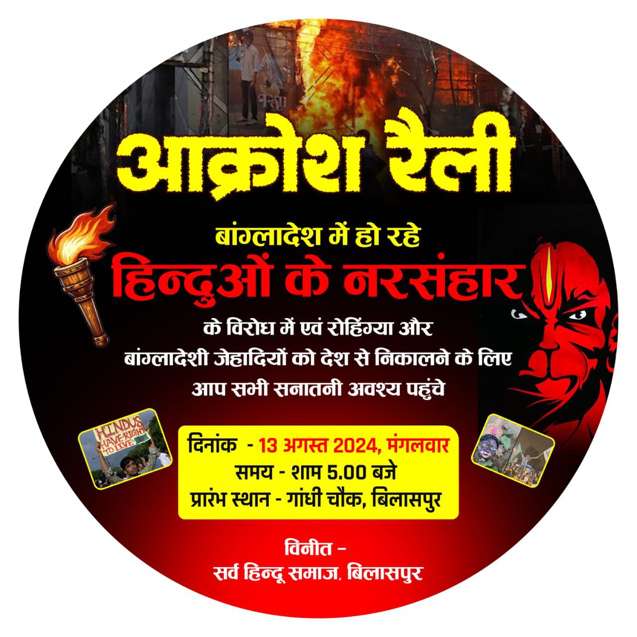 बिलासपुर : आज दिनांक 13/08/2024 को शाम 5 बजे, गांधी चौक से श्री हनुमान मंदिर तिलक नगर बिलासपुर तक हजारों की संख्या में आक्रोश रैली का आयोजन किया गया, बंगला देश में राजनीतिक घटनाक्रम के बाद वहा के बहुसंख्यक मुस्लिम समुदाय द्वारा अपने ही धर्म की प्रधानमंत्री शेख हसीना को बड़ी मुश्किल से जान बचाकर देश से भागने को मजबूर कर दिया !