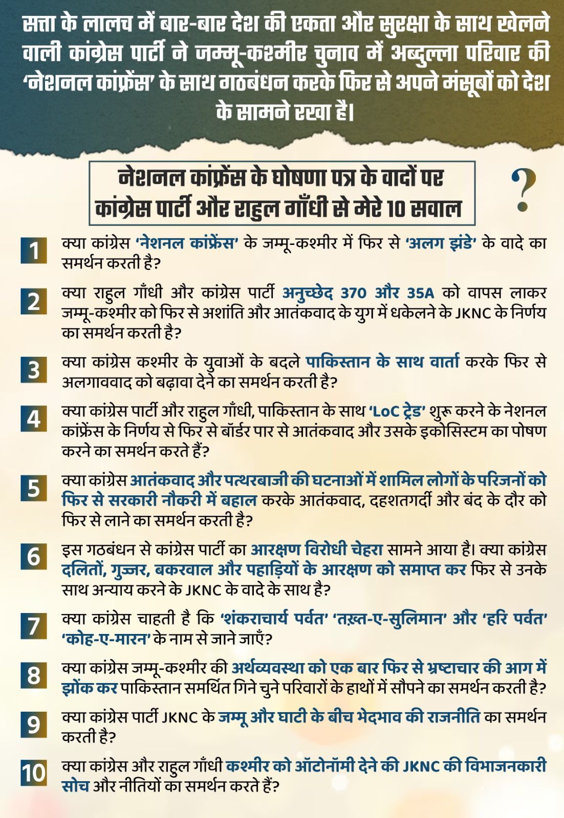 नेशनल कांफ्रेंस के घोषणा पत्र के वादों पर कांग्रेस पार्टी और राहुल गाँधी से मेरे 10 सवाल: