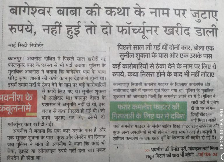 इससे पहले पुलिस पूछताछ में अवनीश ने लग्जरी गाड़ियों को लेकर पुलिस को बताया कि पिछले साल कानपुर देहात के रंजीतपुर में बागेश्वर वाले पंडा धीरेंद्र शास्त्री की कथा का आयोजन कराया था. उसमें सुनील शुक्ला भी आयोजनकर्ताओं में शामिल था. इन दोनों द्वारा अपने-अपने संपर्कों संबंधों को भुनाते हुए कई व्यापारियों से कथा के नाम पर करोड़ों रुपये वसूला गया था !