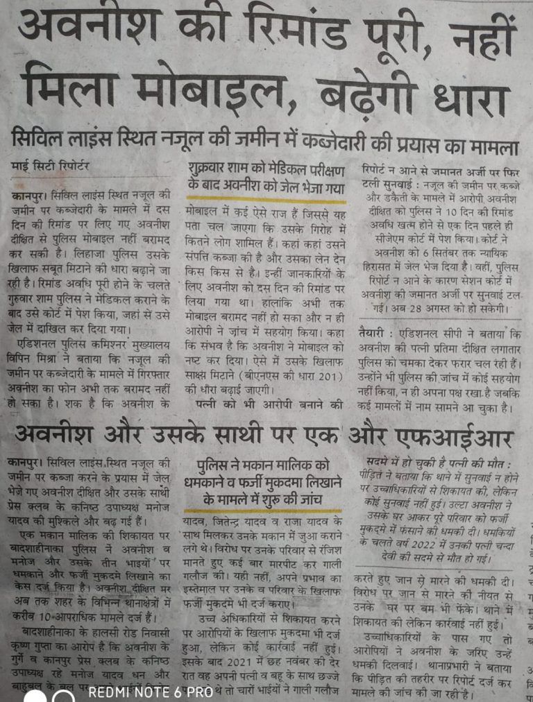 अवनीश दीक्षित कानपुर में पत्रकारिता की आड़ में माफिया के रूप में काम करते हुए कानपुर में एक हजार करोड़ से अधिक की अचल सम्पत्ति पर जबरन गुंडों के बल पर अवैध कब्जा करने का आरोपी है, जैसे जैसे जांच आगे बढ़ रही है अवनीश दीक्षित के काले कारनामों का भंडाफोड़ होता जा रहा है !पत्रकारिता की आड़ में अपराध की दुनिया में माफिया बनने वाले ब्लेकमेलर पत्रकारों
