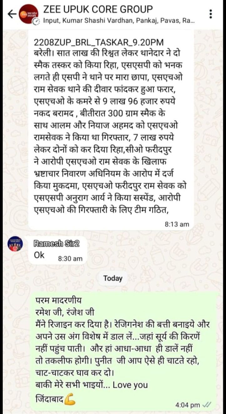 जी यूपी-यूके कोर ग्रुप का यह स्क्रीनशॉट देखिए. इस्तीफा देने वाले ने परम मादरणीय रमेश जी और रंजेश जी का नाम लिखकर इस्तीफा देने की बात कही है. साथ ही यह भी बताया है कि दिए गए इस्तीफे की बत्ती बनाकर डालनी कहां है, आप भी पढ़ें…