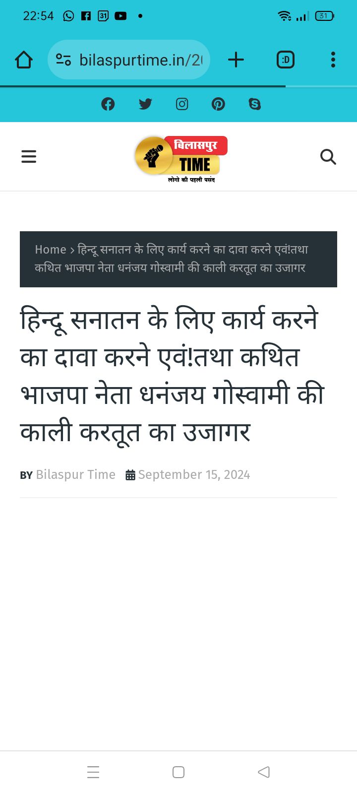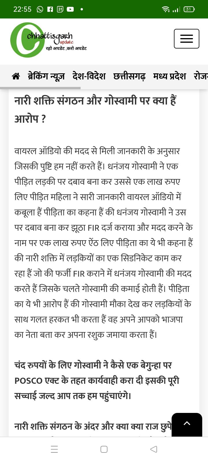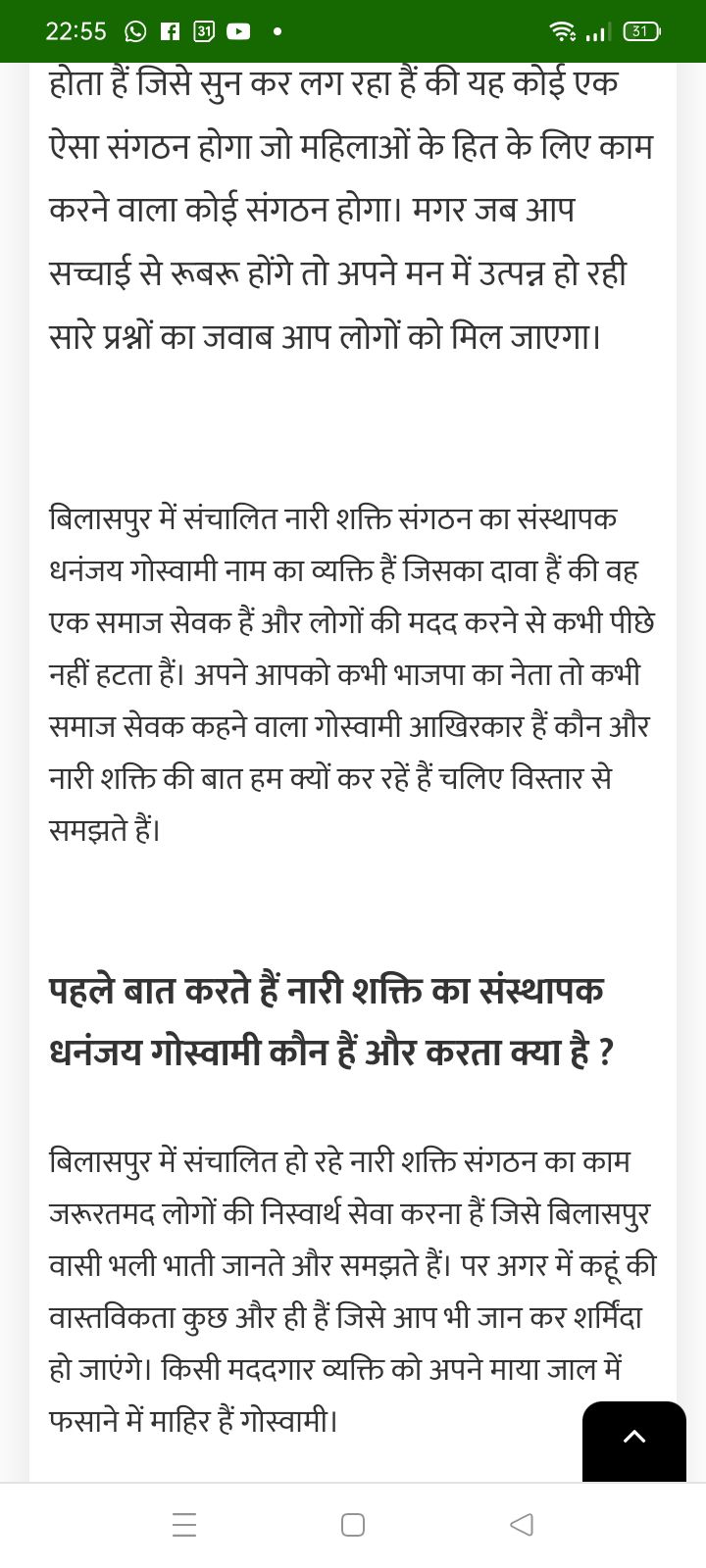 बिलासपुर में दो न्यूज पोर्टल्स द्वारा खबर वायरल है कि, नारी शक्ति टीम के मुखिया धनंजय गोस्वामी के बारे में साक्ष्य विहीन खबर बनाकर वायरल की गई है ! जिसका एकमात्र मकसद हिंदुओ को, हिन्दू संगठनों के छत्रपों को बदनाम कर ठिकाने लगाना प्रतीत होता है ? न्यूज में उल्लेखित दावों के अनुसार