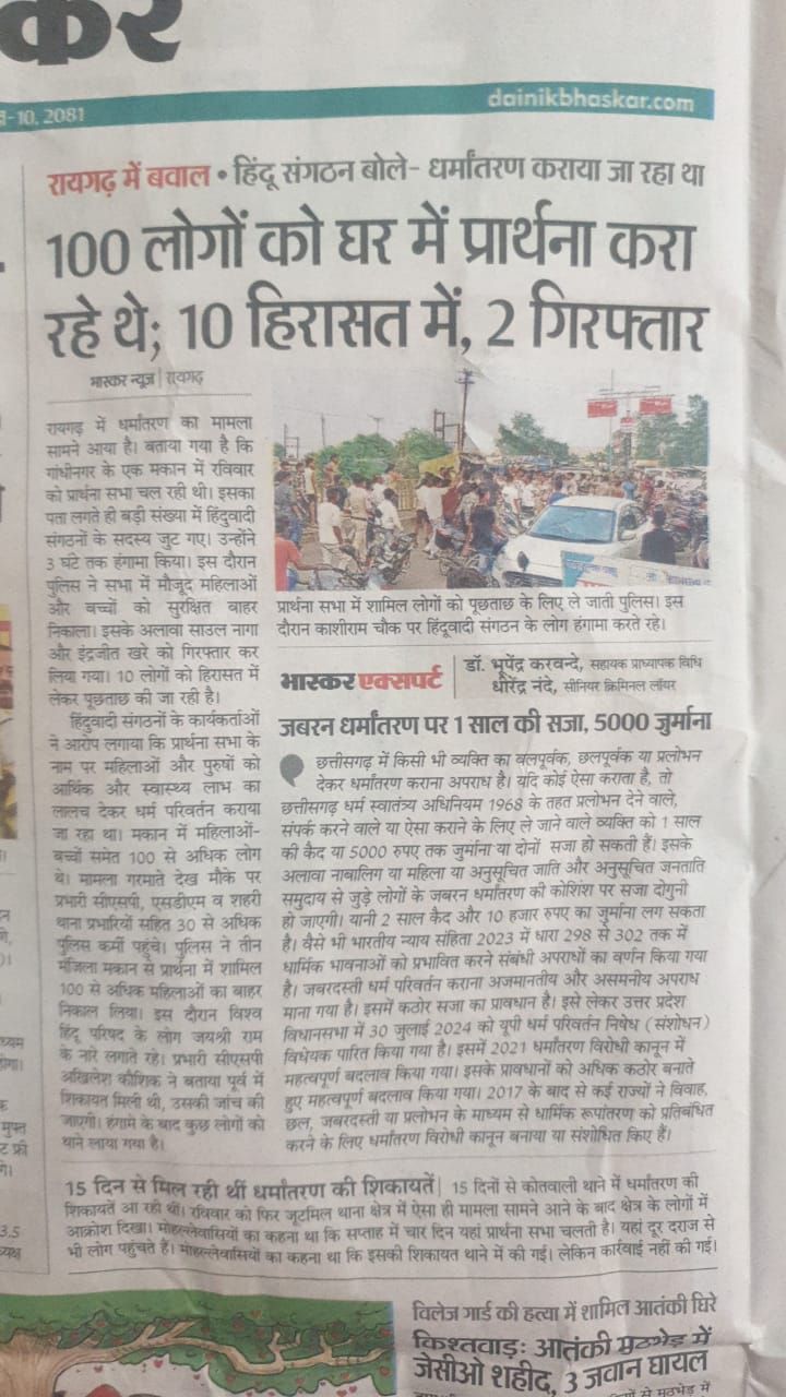 दूसरा मामला रायगढ़ का है, रायगढ़ क्षेत्र में भी दो दिन पहले धर्मांतरण का बड़ा मामला उजागर हुआ, धर्मांतरण में लिप्त कई लोगों की गिरफ्तारियां भी हुई FIR भी दर्ज हुई, इसके बाद रायगढ़,रतनपुर,बिलासपुर सहित छत्तीसगढ़ में धर्मांतरण के लिए उपयोग किए जाने वाले सभी भवनों पर बुलडोजर कार्यवाही की हिन्दू संगठनों की मांग तेज होती जा रही है ! सख्त कार्यवाही के बिना,बुलडोजर कार्यवाही के बिना धर्मांतरण रुकवाने के हिन्दू संगठनों के प्रयास विफल होते नजर आ रहे है !