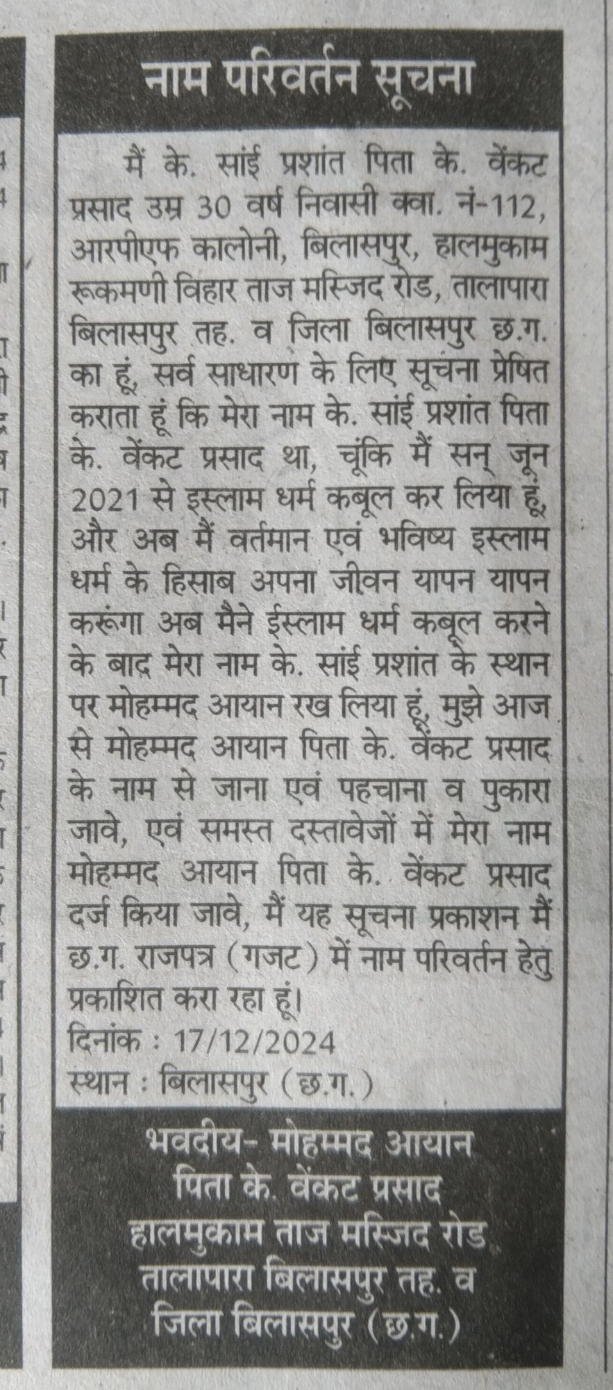 हिंदुओ की, हिन्दू संगठनों की आम शिकायत के अनुरूप हिन्दू क्यों नहीं हो रहा संगठित ? उसकी एक बड़ी वजह ये पेपर प्रकाशन में दिया गया विवरण भी है, ये तो अत्यधिक साहसी होगा ?या होगी कानूनी मजबूरी की दस्तावेजों में नाम सुधरवाना होगा, अन्यथा बिना आम सूचना प्रकाशन के तो पता नहीं कितने पायजामा पहन चुके ?