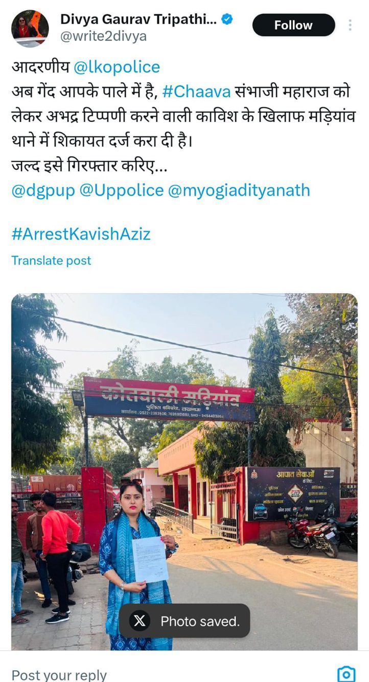 लखनऊ में पूर्व फोटो पत्रकार कविश अज़ीज़ के खिलाफ एक विवादित ट्वीट को लेकर मामला दर्ज किया गया है। उन्होंने हाल ही में रिलीज़ हुई फ़िल्म ‘छावा’ के एक दृश्य पर टिप्पणी करते हुए मुगल शासक औरंगज़ेब का महिमामंडन किया और छत्रपति संभाजी महाराज का अपमान किया। इस ट्वीट के बाद सोशल मीडिया पर व्यापक आक्रोश फैल गया, और कई लोगों ने इसे हिंदू महापुरुषों का अपमान करार दिया। पूर्व पत्रकार दिव्या गौरव त्रिपाठी ने इस संबंध में लखनऊ के मड़ियांव थाने में शिकायत दर्ज कराई है।