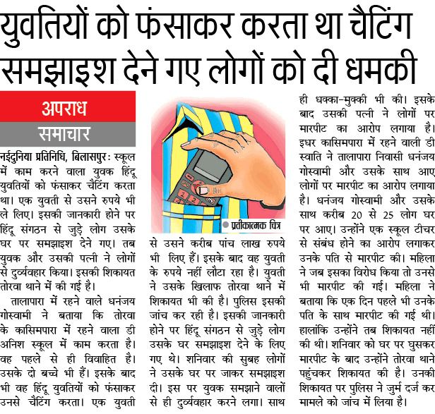 कथित हिंदूवादी सरकार, सत्ता, शासन प्रशासन की असफलता से क्षुब्द होकर बिलासपुर में धनंजय गोस्वामी सहित अनेक हिंदुओ ने धर्मांतरण में लिप्त, हिन्दू लड़कियों को फंसाने के आरोपी की कुटाई क्या कर दिया ? धनंजय गोस्वामी पर FIR दर्ज हो गया !