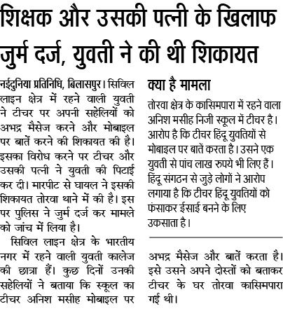हिंदुवादी स्कूल माने जाने वाले स्कूल पर टीचर ईसाई, जिसके द्वारा बिलासपुर के बहुत सारे हिन्दू लड़कियों को लवजेहद में फंसाया गया,