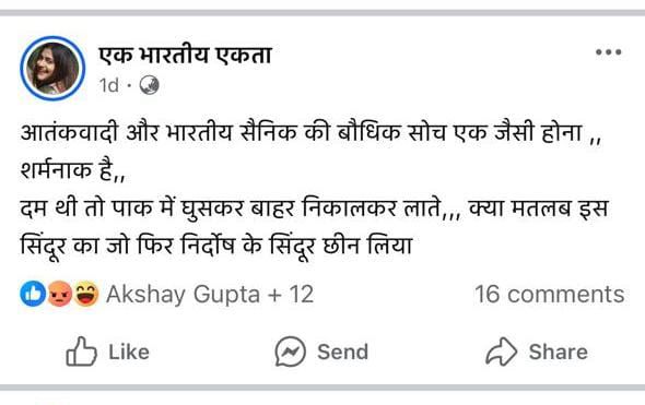 देशद्रोहिणी का काल,सर्वे हिन्दू समाज! एकता गुप्ता का विवादित पोस्ट !