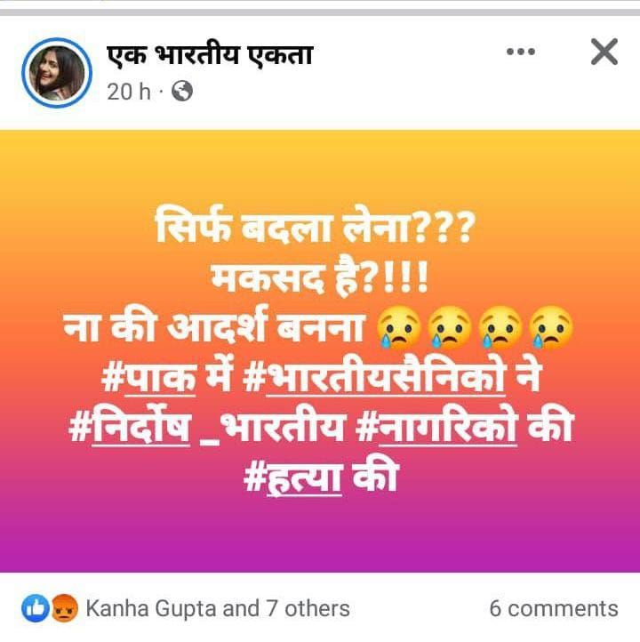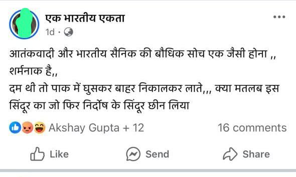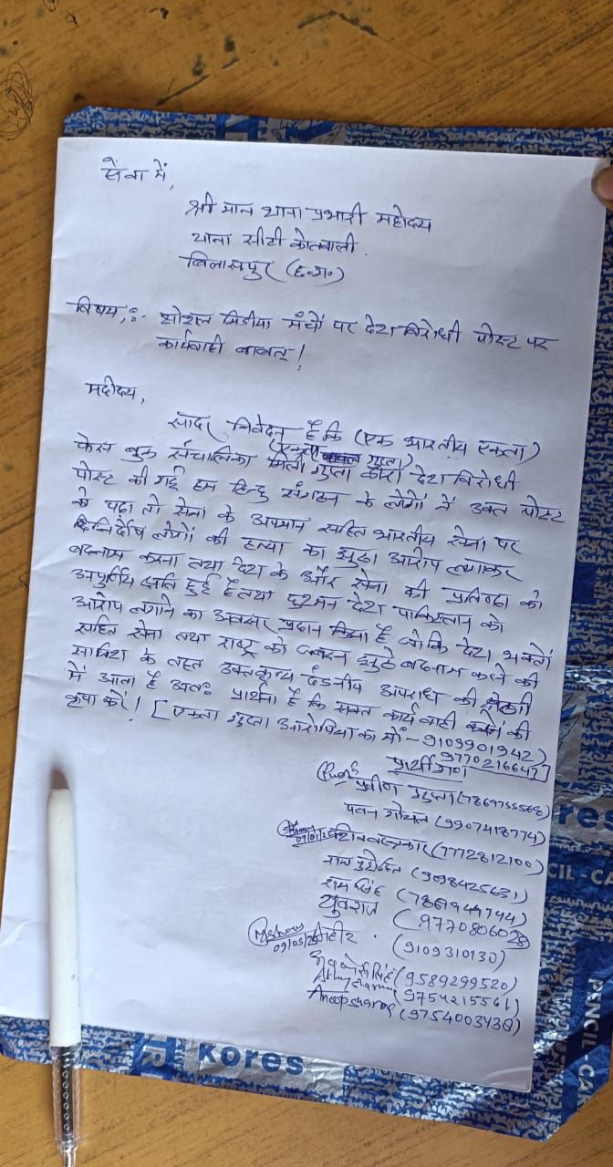 किसी एकता गुप्ता जो कि करगी रोड कोटा निवासी बताई जा रही है ने आज अपने फेसबुक अकाउंट पर सेना सहित मोदी के खिलाफ बेहद अपमानजनक पोस्ट कर देश को शर्मसार किया है ! जिसकी शिकायत थाना सिटी कोतवाली बिलासपुर में किया गया ! तथा कथित देशद्रोहिणी आरोपिया पर देशद्रोह की धाराओं सहित सख्त कानूनी कार्यवाही का मांग सर्वे हिन्दू समाज द्वारा किया गया !