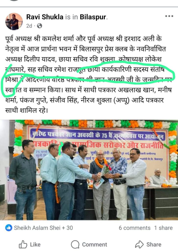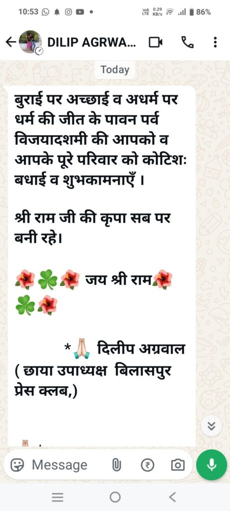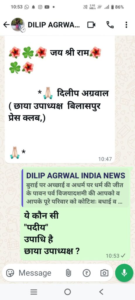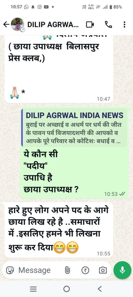 आज दिनांक 02 अक्टूबर को दिलीप अग्रवाल ने हमें वाट्स ऐप पर दशहरा उत्सव पर शुभकामना भेजी तो शुभकामना संदेश के नीचे लिखी इनकी पदीय उपाधि को पढ़कर हम चौंक गए इन्होंने लिखा “दिलीप अग्रवाल,छाया उपाध्यक्ष,प्रेस क्लब बिलासपुर”