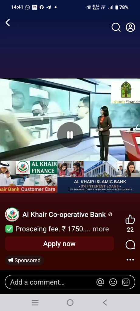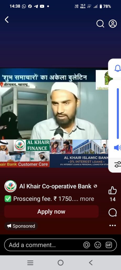 इस्लामिक रीति रिवाजों के अनुरूप संचालित है यह फाइनेंस कंपनी ! नाम है : AL KHAIR इस्लामिक बैंक / AL KHAIR FINANCE, फेसबुक पर इसके विज्ञापन के दावे के अनुसार ये कथित बैंक / फाइनेंस कंपनी सिर्फ अपने मुस्लिम समुदाय के लिए है ! इसे सामान्य तौर पर गजवा ए हिन्द की तैयारी सहित समानांतर बैंकिंग व्यवस्था की तैयारी मानी जा रही है !
