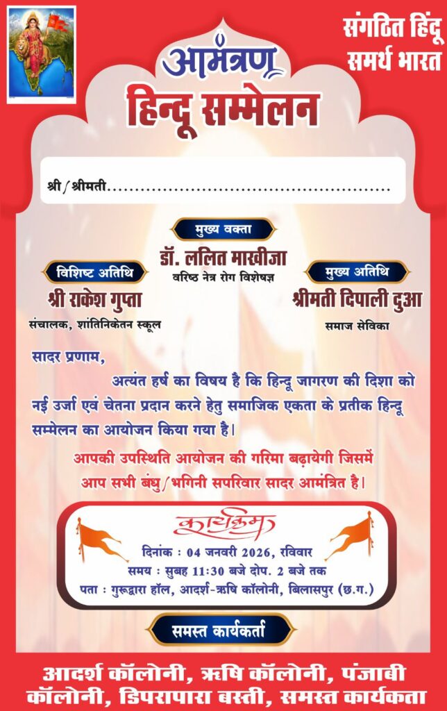 संगठित हिन्दू, समर्थ भारत कार्यक्रम के अंतर्गत हिन्दू सम्मेलन अभियान के अंतर्गत दिनांक 04 जनवरी 2026 को ठीक 11:30 बजे,स्थान गुरुद्वारा हाल, आदर्श ऋषि कालोनी बिलासपुर में मुख्य वक्ता डॉ ललित मखीजा के विचारों को सुनने का सुअवसर बिलासपुर में सनातनियों के लिए अमूल्य मार्गदर्शन साबित होगा !