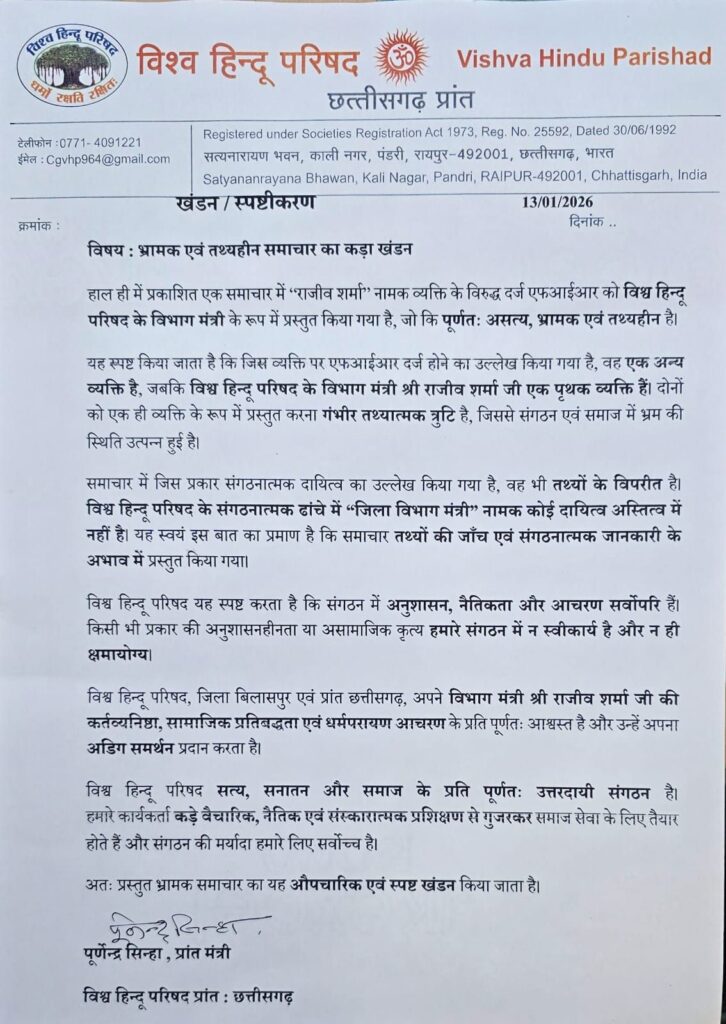 बिलासपुर, राजीव शर्मा, राजकिशोर नगर, शक्ति चौक के पास बिलासपुर जो खुद को VHP बिलासपुर का जिला सुरक्षा प्रमुख बताता फिरता था!जबकि, बजरंग दल जिला संयोजक गौरव धनकर ने बताया कि बजरंग दल में ऐसा कोई पद होता ही नहीं ! तथाकथित राजीव शर्मा जो किसी सिक्योरिटी सर्विस फर्म से निजी सरकारी संस्थानों को गार्ड उपलब्ध कराने की कथित प्रोफेशनल संचालित करता है ! उक्त राजीव शर्मा का VHP वाले राजीव शर्मा नहीं है ! उकताशय के संबंध में VHP प्रांत रायपुर से बकायदा लिखित सूचना भी जारी की गई है ! जिसकी प्रति इस न्यूज के साथ प्रस्तुत है !