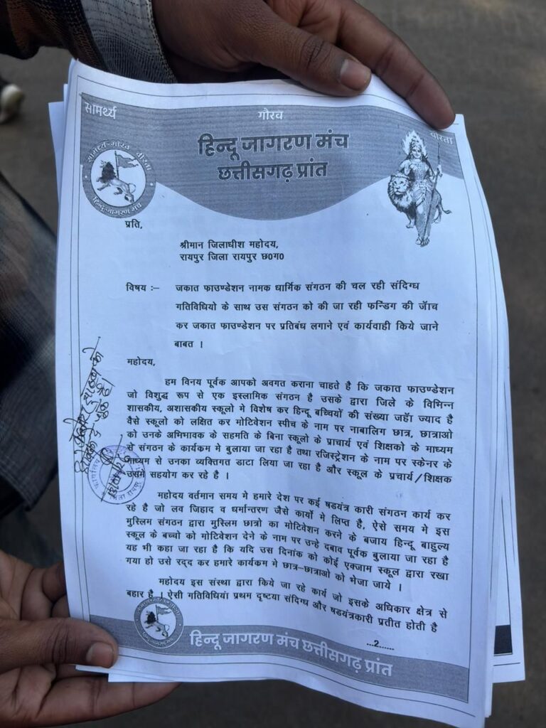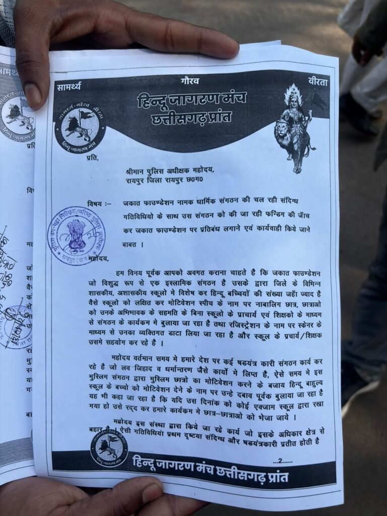 महोदय सादर विनय के साथ आपको अवगत कराना चाहते है कि छत्तीसगढ़ जकात फाउंडेशन जो कि एक शुद्ध रूप से मुस्लिम ngo है जिसका उद्देश्य कैरियर काउंसलिंग के नाम पर हिंदू लड़का लड़कियों को धन तथा स्कॉलर शिप के नाम पर लालच देकर इस्लाम के प्रति झुकाव बढ़ाना तथा लव जिहाद तथा धर्मांतरण जैसे षड्यंत्रों की पूर्व पीठिका तैयार करना है क्योंकि इस्लाम में जकात शब्द का अर्थ अपने पंथ के कार्य को बढ़ाने के लिए दान देना होता है फिर उनका उद्देश्य पवित्र कैसे हो सकता है जकात का अर्थ है जिहाद के लिए दान देना धर्म परिवर्तन के लिए दान देना आतंक बाद के लिए दान देना फिर वह खुले आम किसी भी स्कूलों को बिना क्षात्रों के मात पिता की अनुमति के स्कूलों को सीधे कार्यक्रम में आने के लिए आग्रह या बाध्य कैसे कर सकते है इसके पीछे ओर कौन है इसकी भी जांच होनी चाहिए फिर जब माननीय जिलाधीश महोदय के मना करने के बाद भी जिला शिक्षा अधिकारी के द्वारा भी मना करने के बाद पहले शहीद स्मारक में कार्यक्रम की योजना थी फिर आनन फानन में मेकाहारा अटल सभागृह में बिना अनुमति के कार्य क्रम करने का साहस कहां से मिला इसकी भी जांच होनी चाहिए तथा जिन स्कूलों ने छात्रों की परीक्षा के समय इस प्रकार के षडयंत्र कारी कार्यक्रम में भेजा उनके खिलाफ भी दंडात्मक कार्यवाही करना चाहिए तथा आयोजन करने वाले संगठन के खिलाफ भी शक्त कदम उठाना चाहिए क्योंकि बिना अभिभावक की अनुमति के विद्यार्थियों की परीक्षा को प्रभावित करना एक दंडनीय अपराध हे