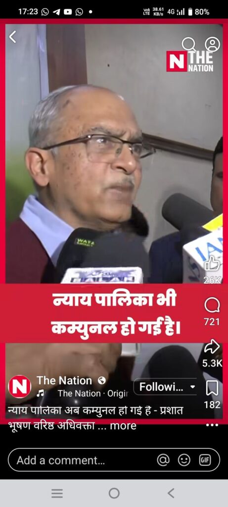 वीडियो अनुसार प्रशांत भूषण ने न्यायपालिका पर अत्यधिक गंभीर आरोप लगाया है कि न्यायपालिका अब कम्युनल हो गई है !