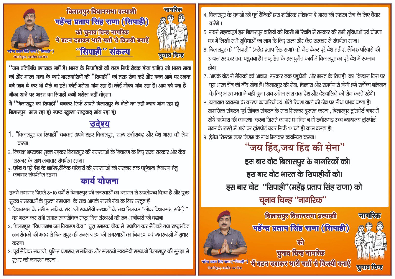 बिलासपुर : बिलासपुर विधानसभा चुनाव में राष्ट्रवादी/हिंदूवादी और पूर्व सैनिकों के सम्मान को बनाए रखने हेतु एक विशेष मिशन में लक्ष्य की ओर अग्रसर,खुद भी पूर्व सैनिक रहे महेंद्र प्रताप सिंह राणा को अब जरूरत है बिलासपुर के तमाम हिंदूवादी/राष्ट्रवादी/असली वाले देशभक्त समर्थको की, जो बिलासपुर विधानसभा चुनाव में महेंद्र प्रताप सिंह राणा को अपने बहुमूल्य वोटो से विजयी बनाकर, पूर्व सैनिकों के सम्मान की आवाज को छत्तीसगढ़ की विधानसभा सहित देश की राजनीति में पूरे दम खम के साथ उठा सके ? तो फिर देशभक्त/राष्ट्रवादी/हिंदूवादी मतदाताओं,उठो, जागो और एकमत से भारी बहुमत से बिलासपुर विधानसभा चुनाव में महेंद्र प्रताप सिंह राणा के पक्ष में “परिवार” चुनाव चिन्ह, मतदान मशीन में 17वे नंबर पर बटन दबाकर,समर्थन करे, ताकि आवाज बनकर छत्तीसगढ़ विधानसभा में आपके लिए एक बुलंद राजनीतिक आवाज बन सकू ? महेंद्र प्रताप सिंह राणा द्वारा आज अपने समर्थक मतदाताओं सहित आम और खास मतदाताओं से जनसंपर्क के दौरान उक्ताशय के विचार प्रकट करते समर्थन मांगा, और साथ ही अपना चुनावी घोषणा पत्र भी जारी किया !