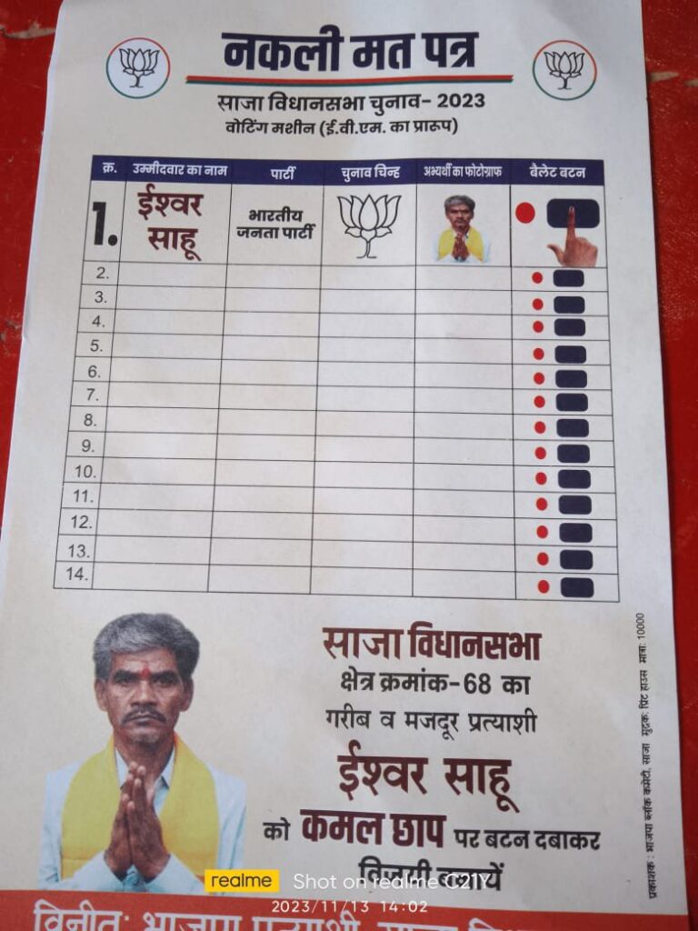 ऐसा पहली बार हुआ कि साजा विधानसभा की जनता चुनाव लड़ रही है, हर मतदाता अपने आप में ईश्वर साहू को देख रहा है, छत्तीसगढ़ की राजनीति में ऐसा भी पहली बार हुआ है कि ईश्वर साहू जैसा BPL कार्ड धारी व्यक्ति को बीजेपी ने अपना उम्मीदवार बनाया और जनता उमड़ पड़ी हो?ईश्वर साहू के जनसमर्थन को देख कर, कांग्रेस प्रत्याशी की नींद उड़ी हुई है, साजा विधानसभा क्षेत्र से लगातार पांच बार के चुनावी विजेता के नोटो के बंडल भी मतदाताओं को प्रभावित नही कर पा रहे है ? साजा विधानसभा क्षेत्र की जनता ने समझ लिया है कि विकास कम हो या ज्यादा?जब एक समुदाय विशेष से लोग सुरक्षित ही नही होंगे, लोगो की जान,माल सुरक्षित नही होंगे तो विकास को क्या चाटेंगे ? ईश्वर साहू के परिवार को न्याय नहीं मिलना, ऐसी चुनावी जनक्रांति बनेगी, किसी कांग्रेसी सहित भूपेश बघेल ने भी नही सोचा था ? साजा विधानसभा क्षेत्र की जनता ने ठाना है अबकी बार एक नंबर पर बटन दबाना है ! हम लगातार साजा विधानसभा क्षेत्र के मतदाताओं के संपर्क में है, जनता से मतदाताओं से मिले इनपुट अनुसार, मतदाताओं की सुविधा हेतु सैंपल वोटिंग मशीन का फोटो प्रदर्शित है ताकि मतदाताओं को मतदान करने में सुविधा हो ?