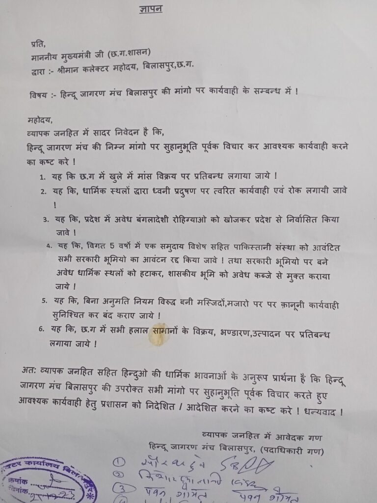 बिलासपुर : आज दिनांक 21/12/2023 को हिन्दू जागरण मंच ने कलेक्टर बिलासपुर की अनुपस्थिति में डिप्टी कलेक्टर श्री दुबे जी को ज्ञापन देकर मांग किया कि छः ग में खुले में मांस विक्रय पर पाबंदी लगाए ! प्रदेश में अवैध बांग्लादेशी रोहिंग्याओ को खोजकर निर्वासित किया जाए, विगत 5वर्षो में एक समुदाय विशेष सहित पाकिस्तानी संस्था को आवंटित सरकारी जमीनों के आवंटन रद्द करना ! छत्तीसगढ़ में हलाल प्रोडक्ट्स के विक्रय,भंडारण, ओर उत्पादन पर पूर्णतया प्रतिबंध लगाना ! धार्मिक स्थलों द्वारा ध्वनि प्रदूषण पर सख्त कार्यवाही ! एक समुदाय विशेष द्वारा बिना अनुमति,सरकारी जमीनों पर अतिक्रमण कर बनाए गए अवैध मस्जिदों,मजारों को हटाकर सरकारी जमीनों को अतिक्रमण मुक्त कराना ! तथा छत्तीसगढ़ में खुले में मांसाहारी चीजों सहित मांस विक्रय/पशु वध पर प्रतिबंध लगाने की मांग का एक ज्ञापन हिंदू जागरण मंच द्वारा हिन्दू जागरण मंच के मुख्य पदाधिकारी श्री सौरभ दुबे (प्रदेश सह संयोजक, हिन्दू जागरण मंच) के नेतृत्व में अपने अन्य सभी पदाधिकारियों के साथ सभी के समर्थन से मुख्यमंत्री श्री विष्णु देव साय के नाम ज्ञापन डिप्टी कलेक्टर बिलासपुर को सौंपकर अपनी मांगों पर कार्यवाही करने की मांग किया है !