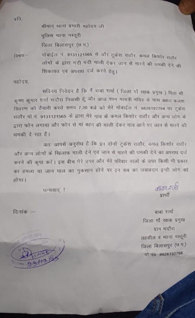 बिलासपुर (मस्तूरी) : छत्तीसगढ़ में हिंदुओ को विगत 5 वर्षो में जिस तरह से प्रताड़ित किया उसके प्रतिकार स्वरूप अब हिंदुओ का प्रतिरोध सामने आ रहा है ! अब हिंदुओ को मजबूरी मे रण होगा की नीति पर चलना ही होगा ! कानूनी कार्यवाही /खानापूर्ति अपनी जगह, लेकिन हिंदुओ को गौ माता की रक्षा,सुरक्षा करने में बाधा बनने वाले जयचंद हिंदुओ सहित विधार्मियो से अब सख्ती से निपटना होगा, और यह तभी संभव है जब संगठित हिंदू सामूहिक रूप से प्रतिकार करे,अब हिंदुओ को अपने धर्म कर्म के क्रिया कलाप को निर्वाध रूप से संपन्न करने में बाधा बनने वाले विधर्मियों से सख्ती से निपटने का सही वक्त आ गया है, इसी क्रम में संगठित हिंदुओ ने मस्तूरी थाना क्षेत्र में गौ रक्षक पुणेनद्र शर्मा उर्फ बाबा शर्मा ग्राम भदौरा मस्तुरी को कभी साहेब लाल तो कभी टुकेश् और कमल किशोर राठौर द्वारा जान से मारने की धमकी मा बहन की गाली गलोज के साथ दी जा रही थी तो बिलासपुर से हिंदू भाईयो ने थाना मस्तूरी जाकर सामूहिक रूप से आरोपियों पर कार्यवाही हेतु दबाव बनाए जाने पर संबंधित आरोपियों के विरुद्ध उचित धाराओं में FIR दर्ज होना संभव हुआ ! इस कार्य में दूध से दही बनाने में जामन की भूमिका निभाने वाले संगठन की अहम भूमिका रही !
