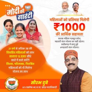 सौरभ दुबे हिन्दू जागरण मंच से प्रदेश की सभी बहनों, माताओं,बेटियो से आग्रह करता है कि महतारी वंदन योजना भाजपा का आपके प्रति सम्मान है ! किसी भी कांग्रेसी के बहकावे में आकर इस लाभ से वंचित न हो !